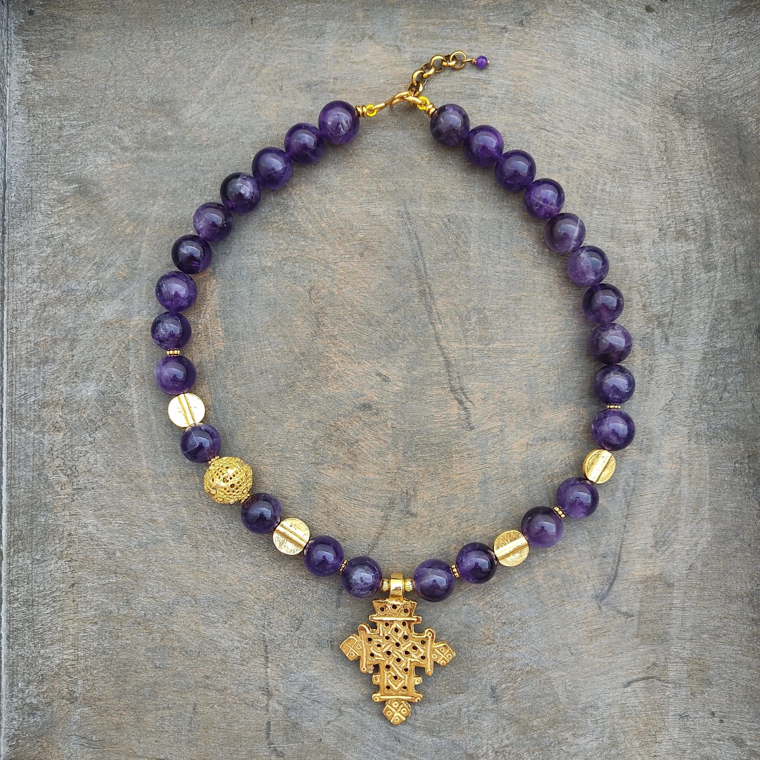 El Collar Minor presenta una cruz de diseño elegante y está elaborado en Amatista, Peltre y Bronce con Baño de Oro de 18 quilates.