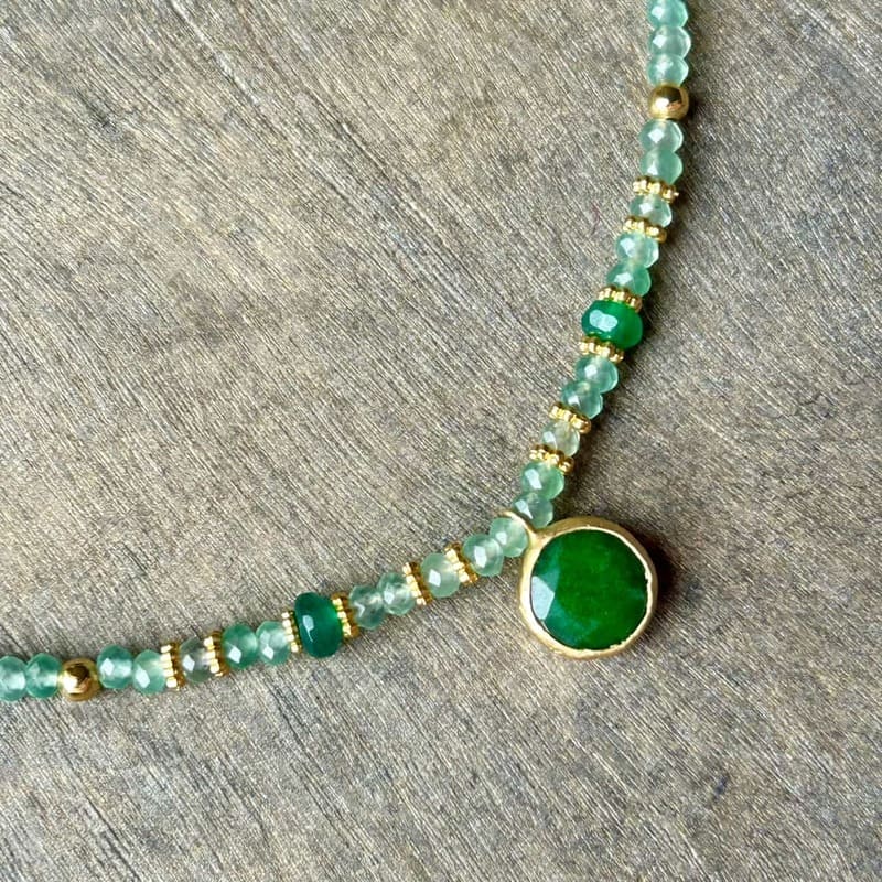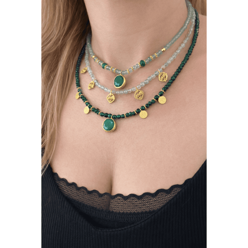 El Collar Origen Aqua es un collar fino en Ágata verde água, con elementos metálicos elaborados íntegramente en Peltre y acabado en Baño de Oro de 18 quilates.