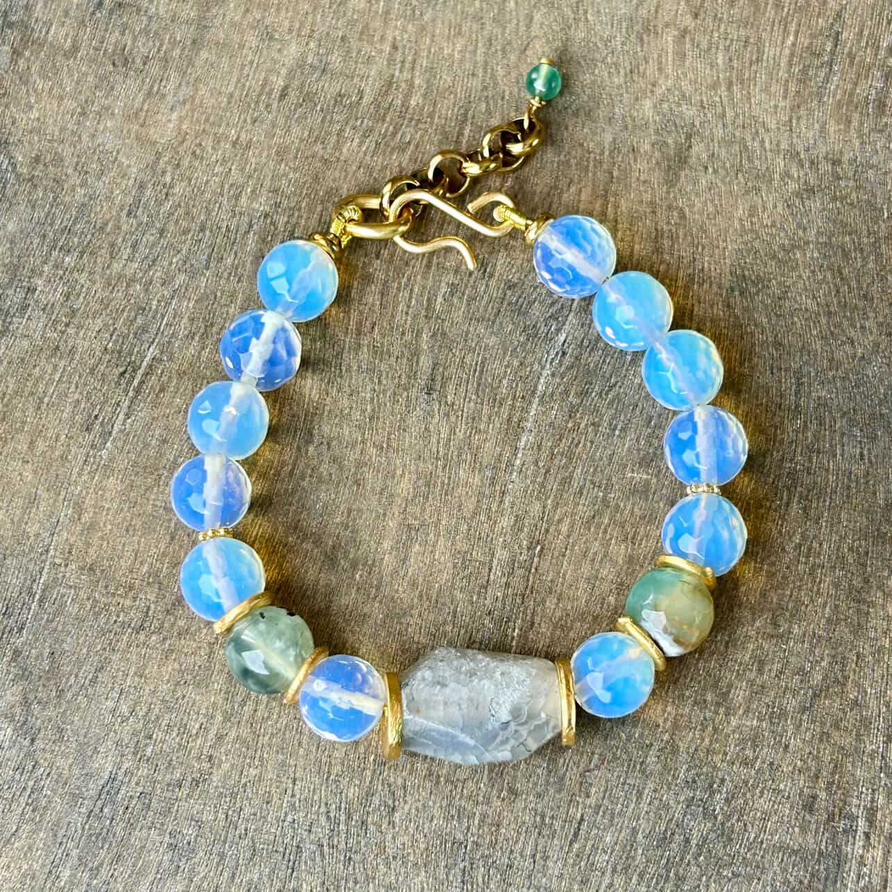 El Ópalo añade luminosidad y delicadeza, mientras que la Ágata aporta equilibrio y profundidad cromática. El Peltre con Baño de Oro de 18 quilates completa el conjunto con un acabado cálido y sofisticado, creando una pulsera armoniosa y atemporal.