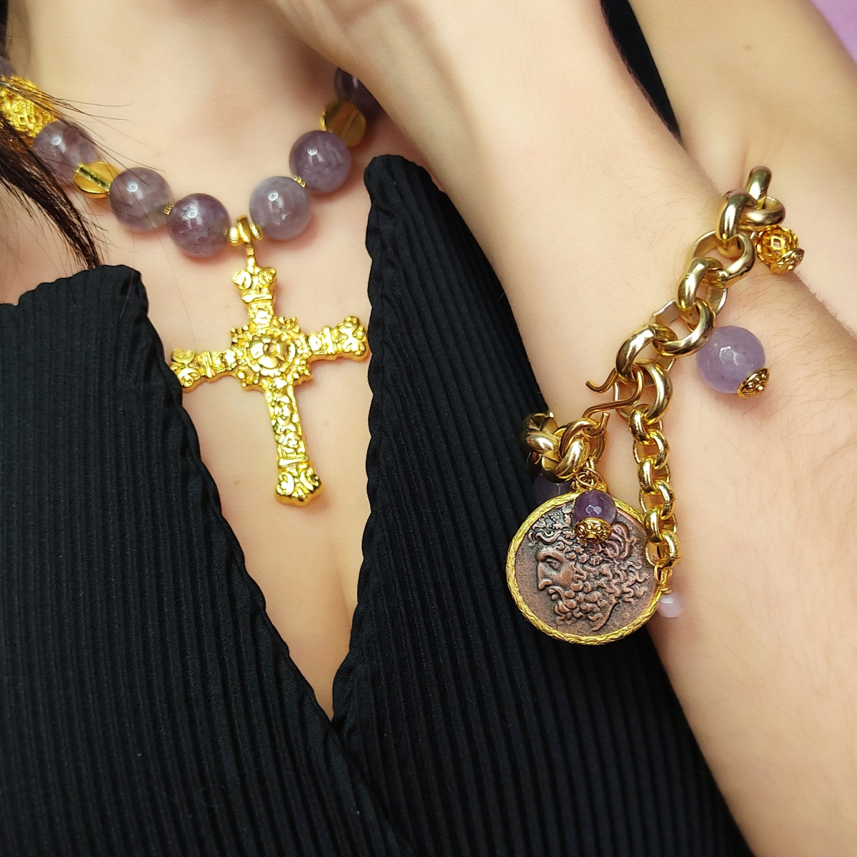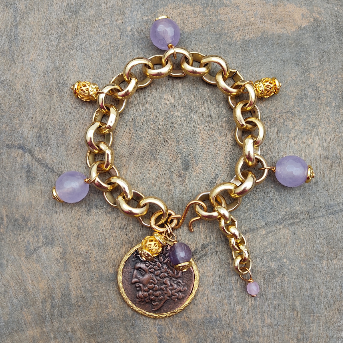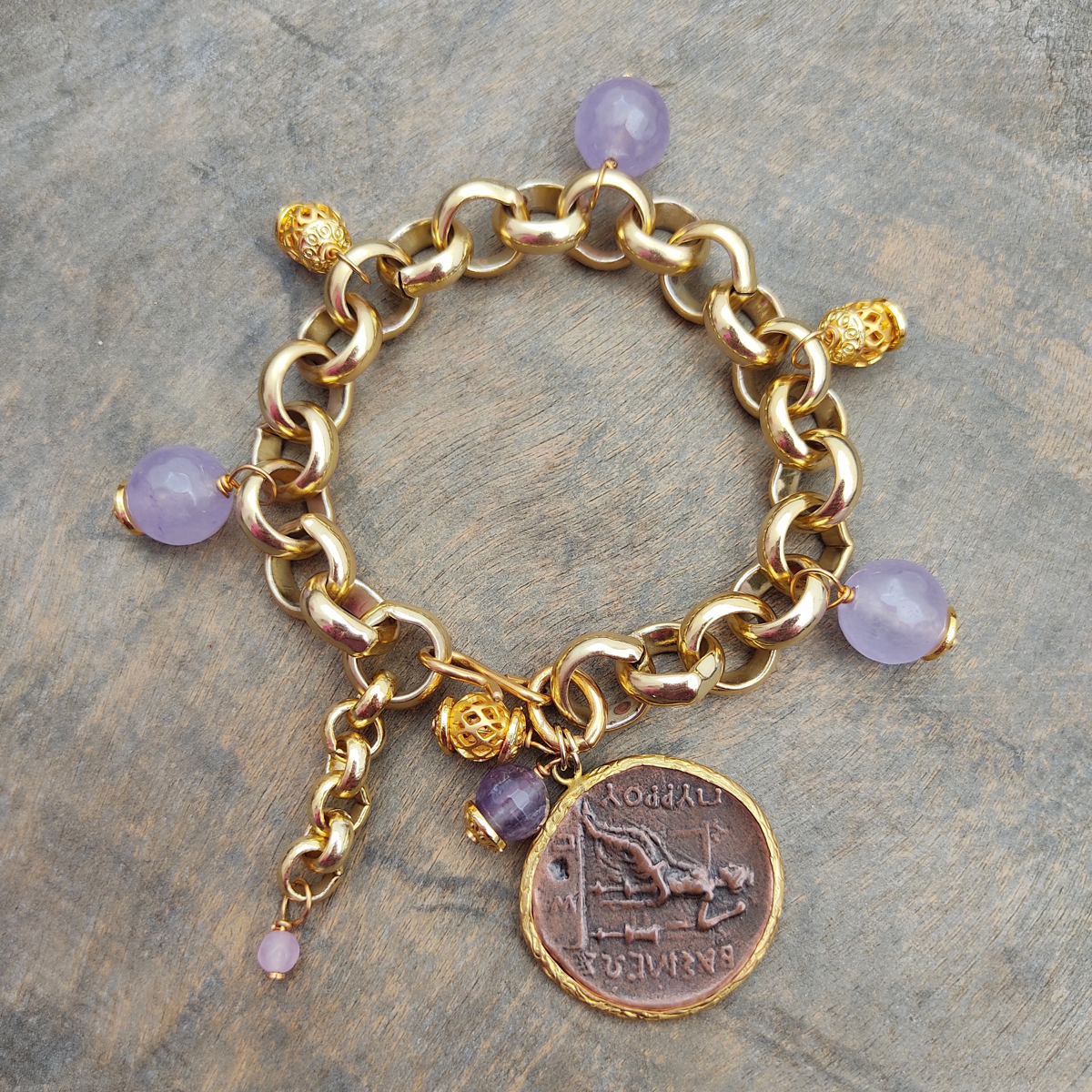 Pulseira em ametista e estanho com banho de ouro de 18 quilates