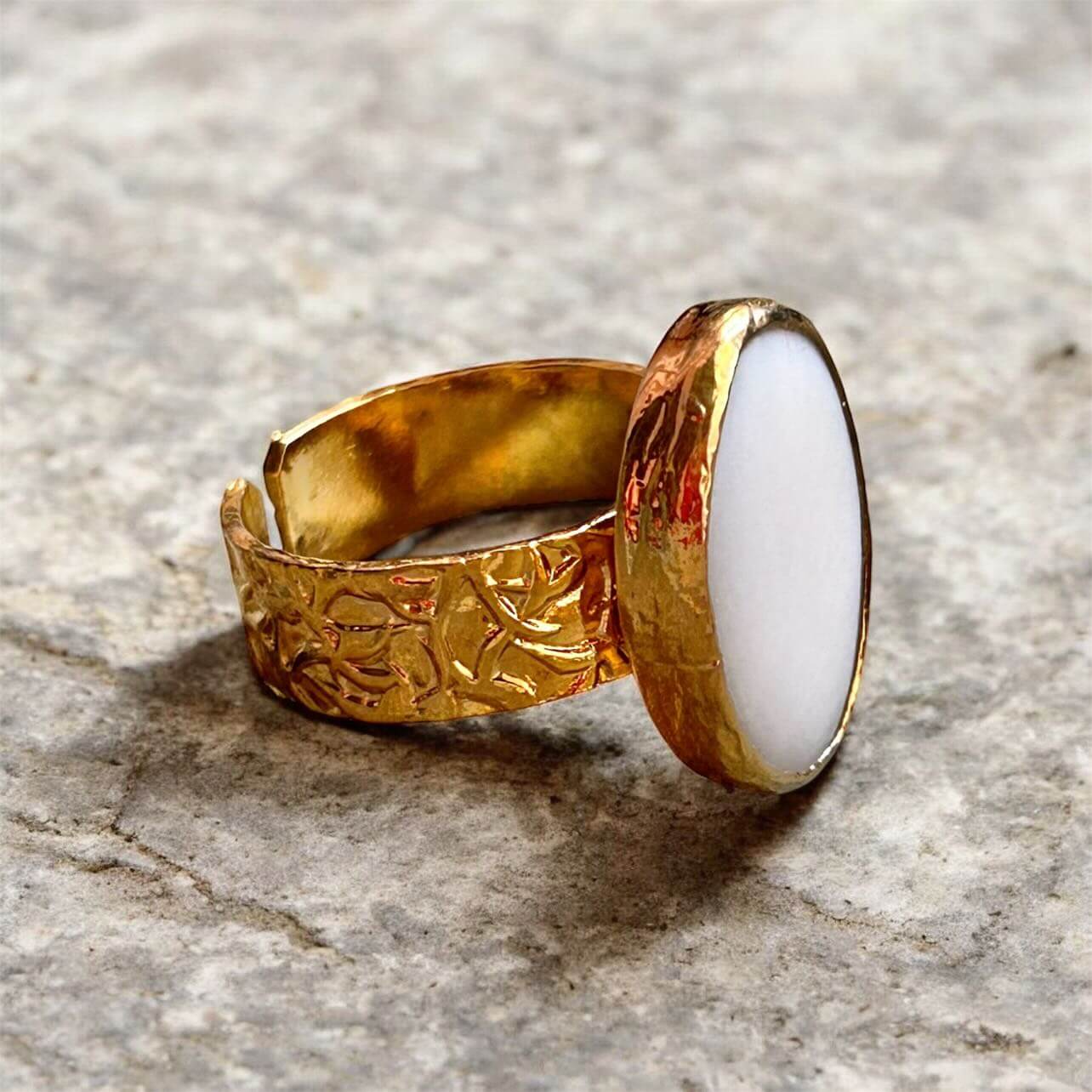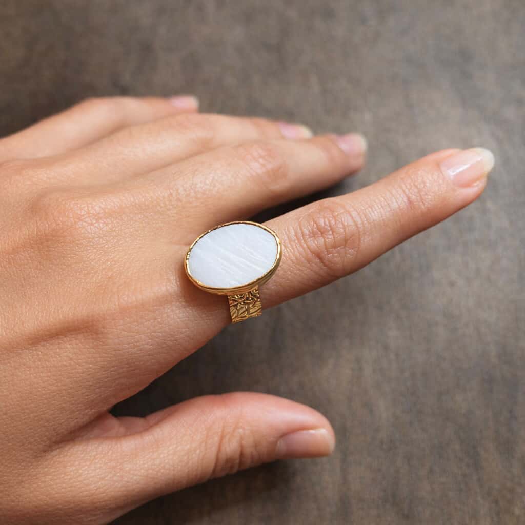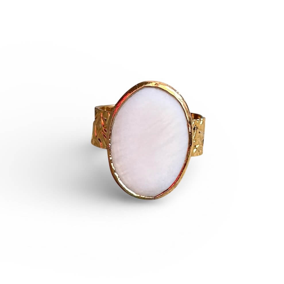 Anel de Madrepérola e Peltre com Banho de Ouro de 18 quilates.